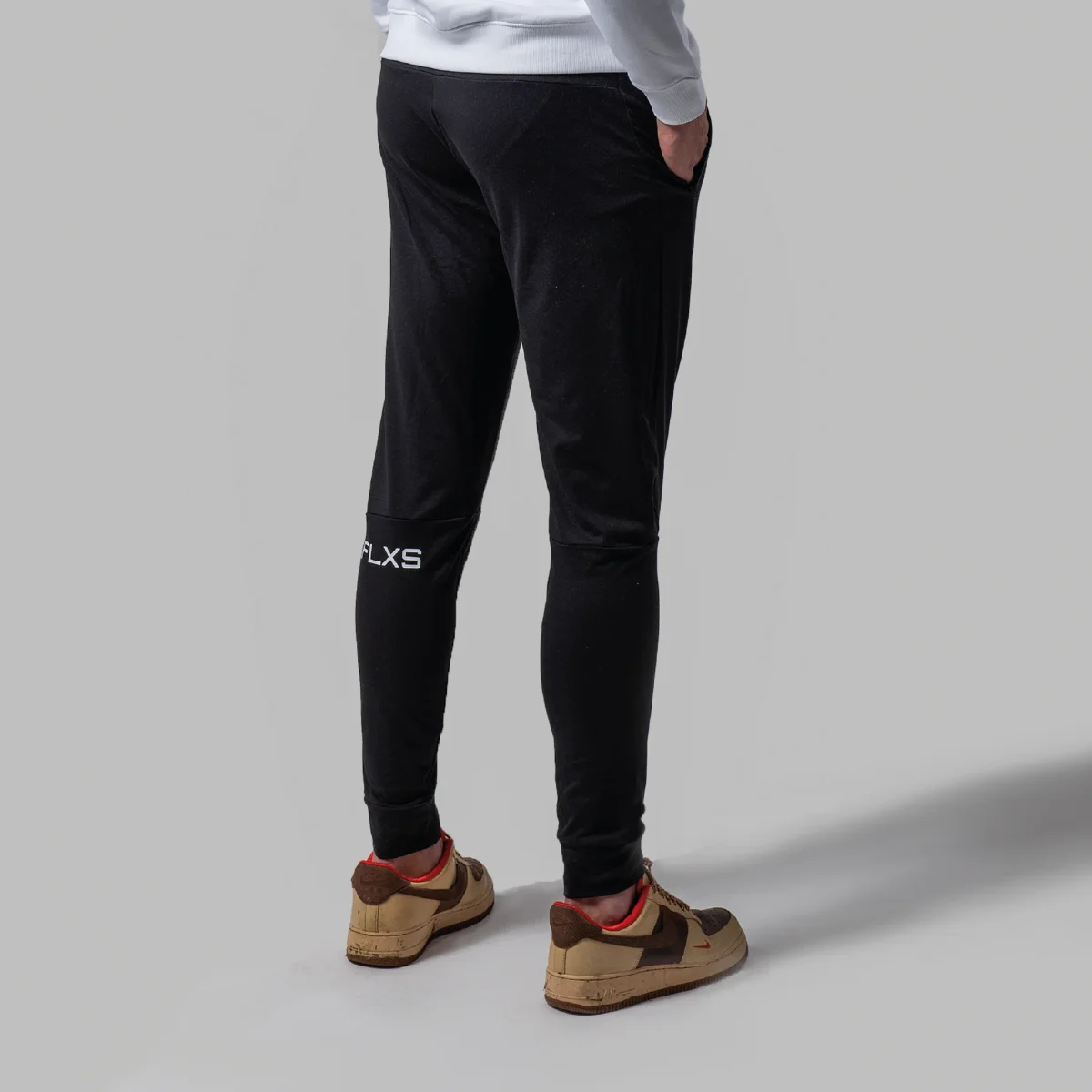 Logga placerad på vänster ben fram och baksida.