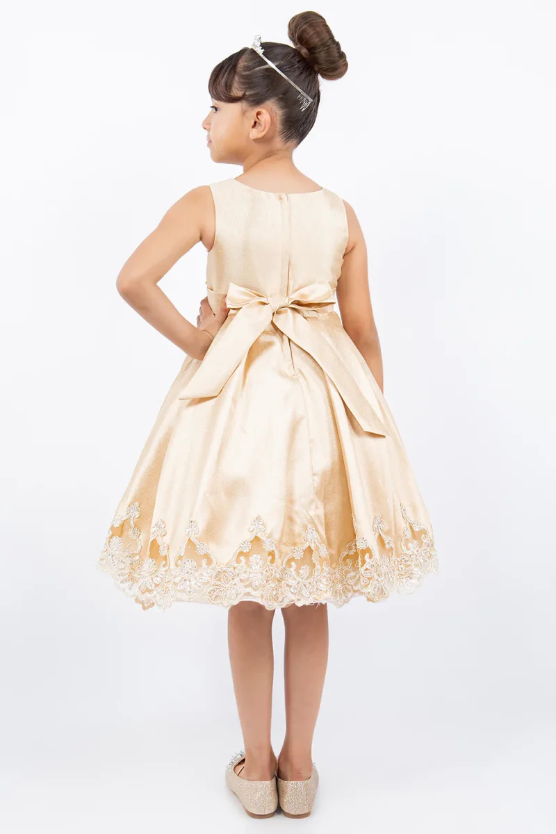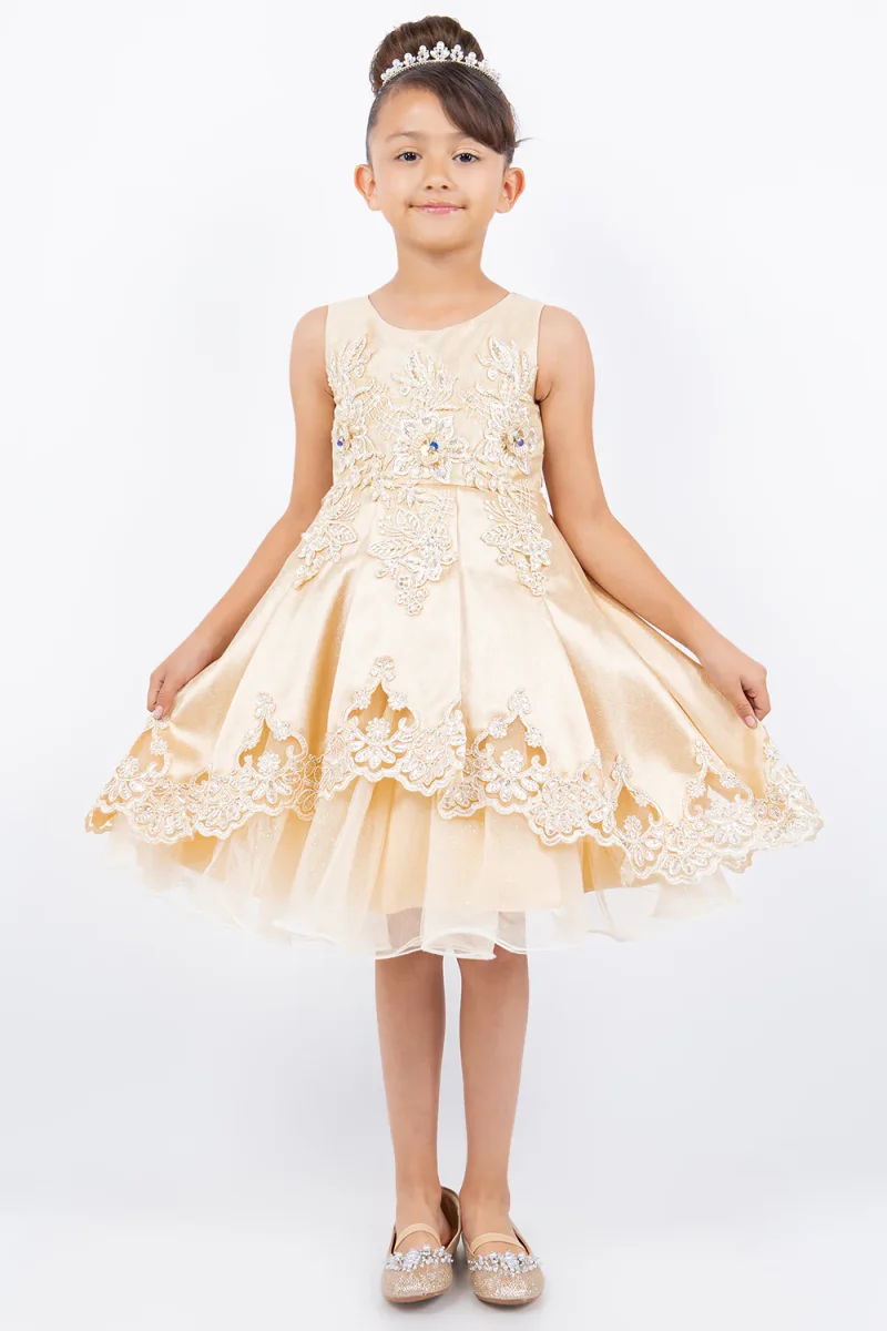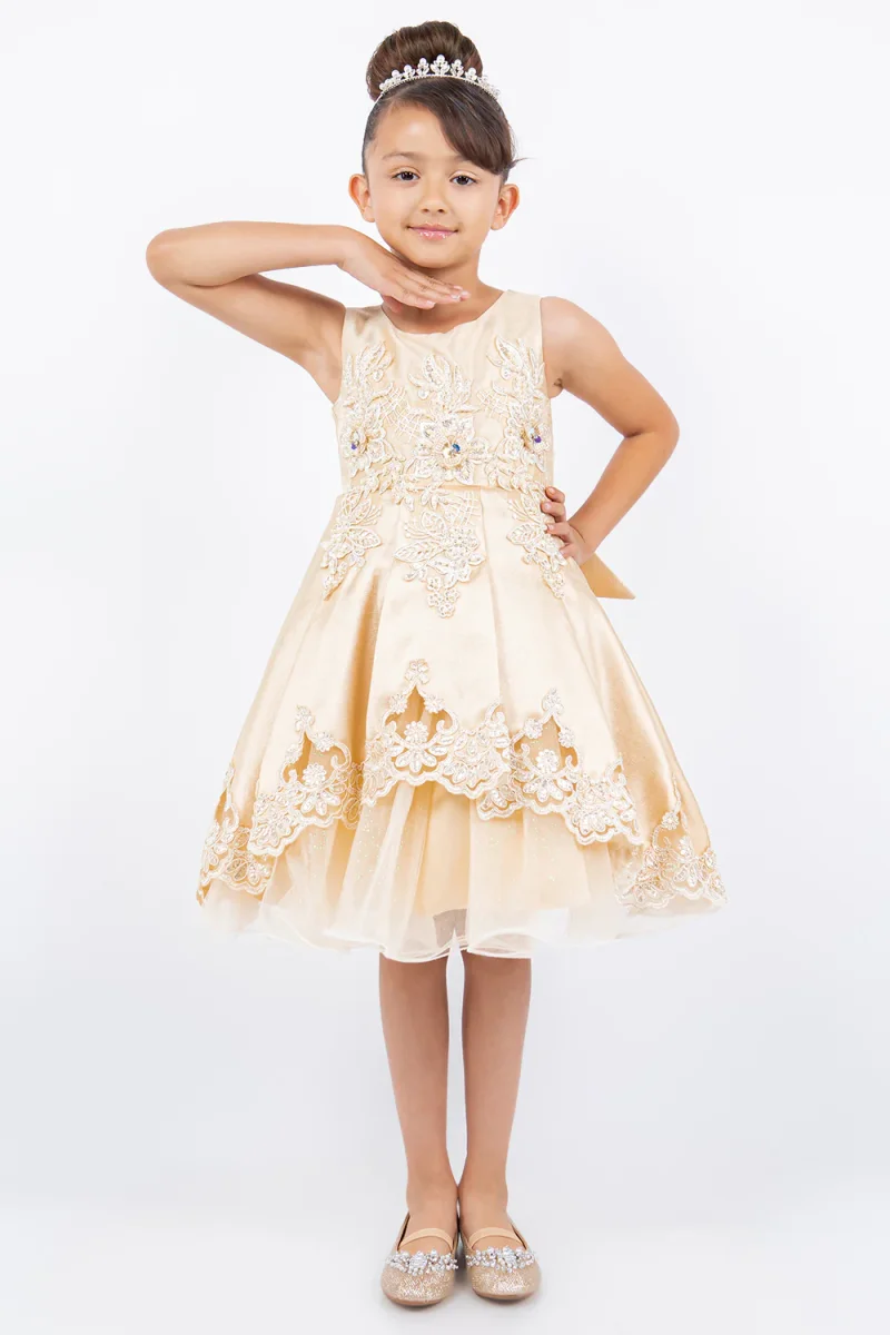 Beautiful satin dress, decorated with crochet lace. Laser cut trimming skirt bottom. A perfect piece for your special occasion.