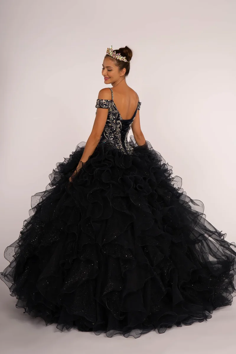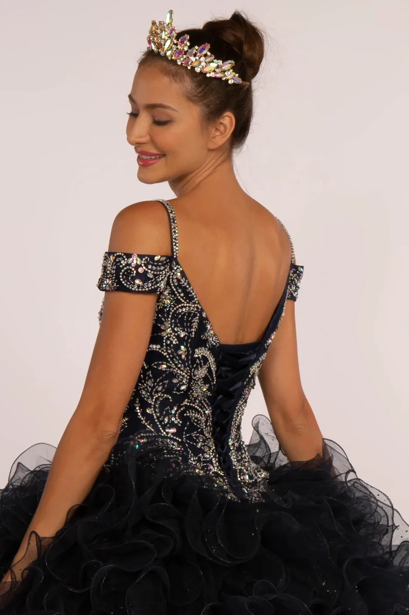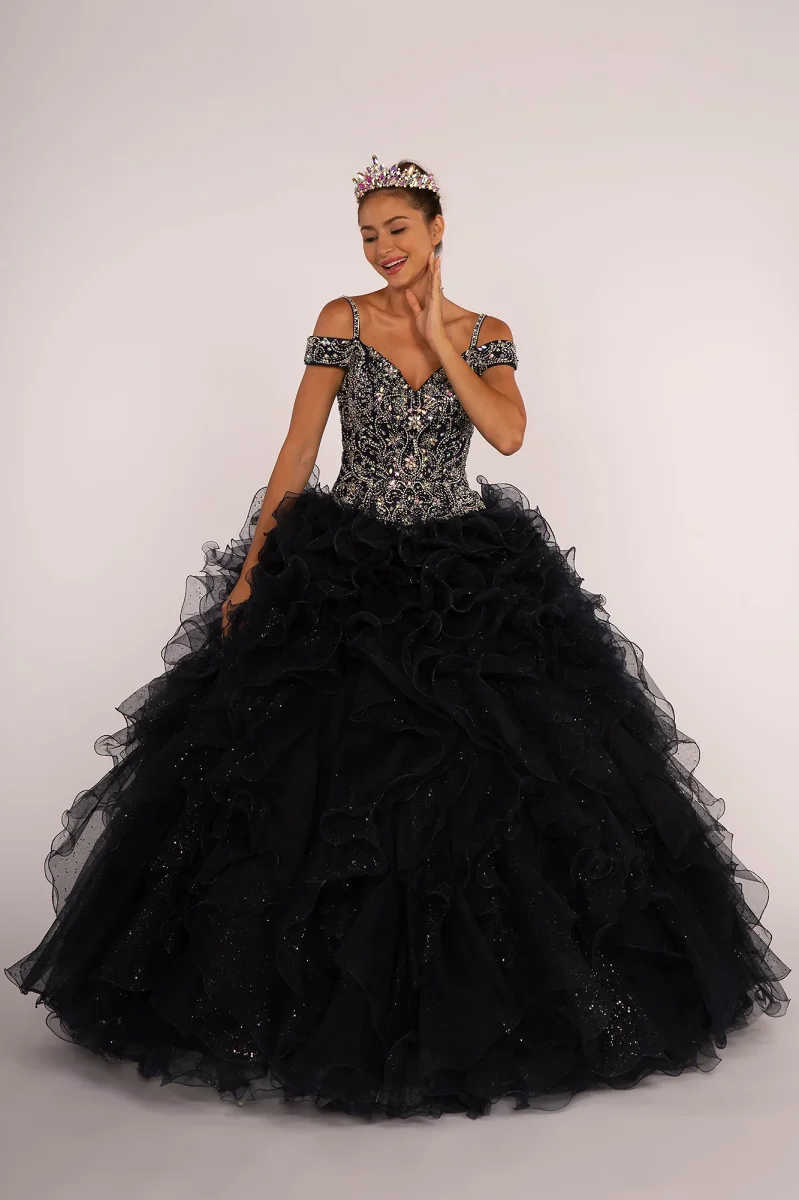 Details: Jewel Embellished Cut-Away Shoulder Ruffle Skirt Quinceanera Dress
