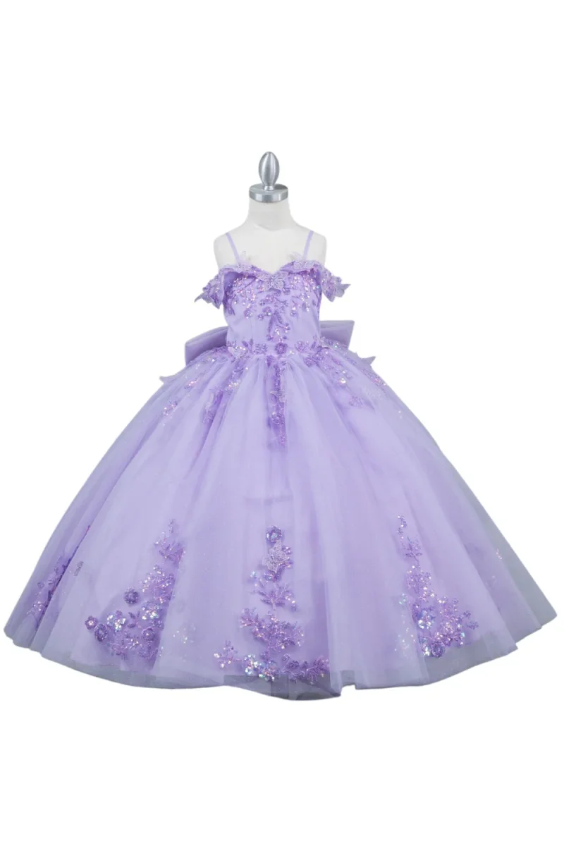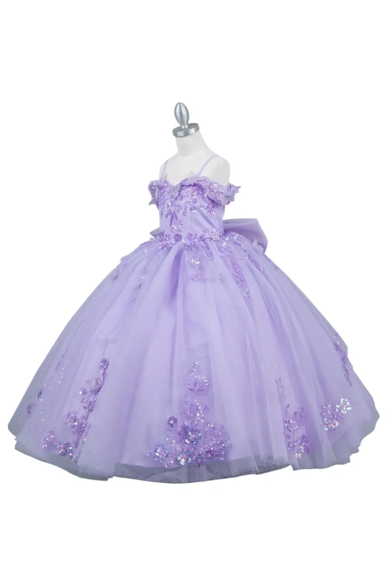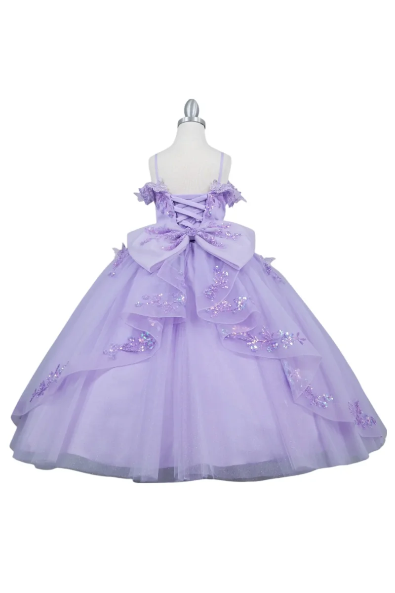 Look breathtaking in this bead embroidered long off the shoulder dress with A-line skirt. Sweetheart neckline with off shoulder straps and bead embroidered bodice. Multiple glitter tulle with sequin appliques ball gown tulle skirt. Lace-up back and sweep train.