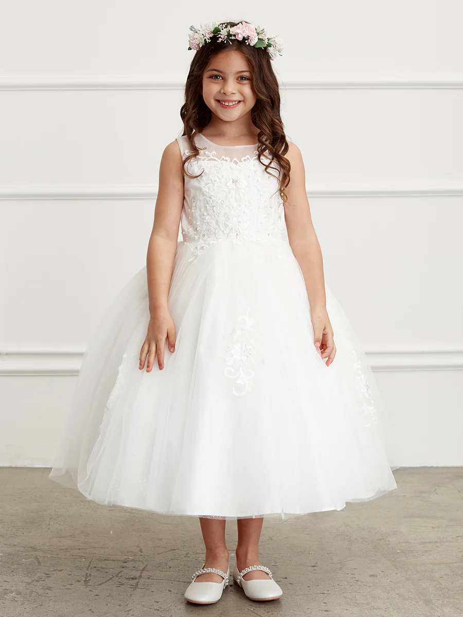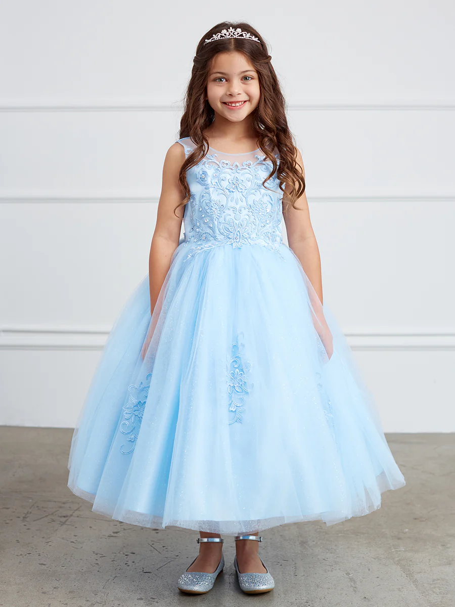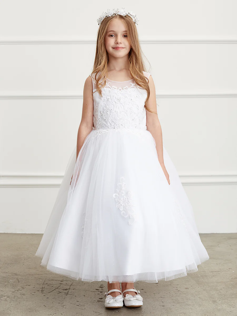 TIPTOP KIDS AS5818 – Illusion Sweetheart Neckline. Lace Bodice and Scattered Lace Appliques. V-Back with Zipper-Closure. Big Satin Bow at the Back.