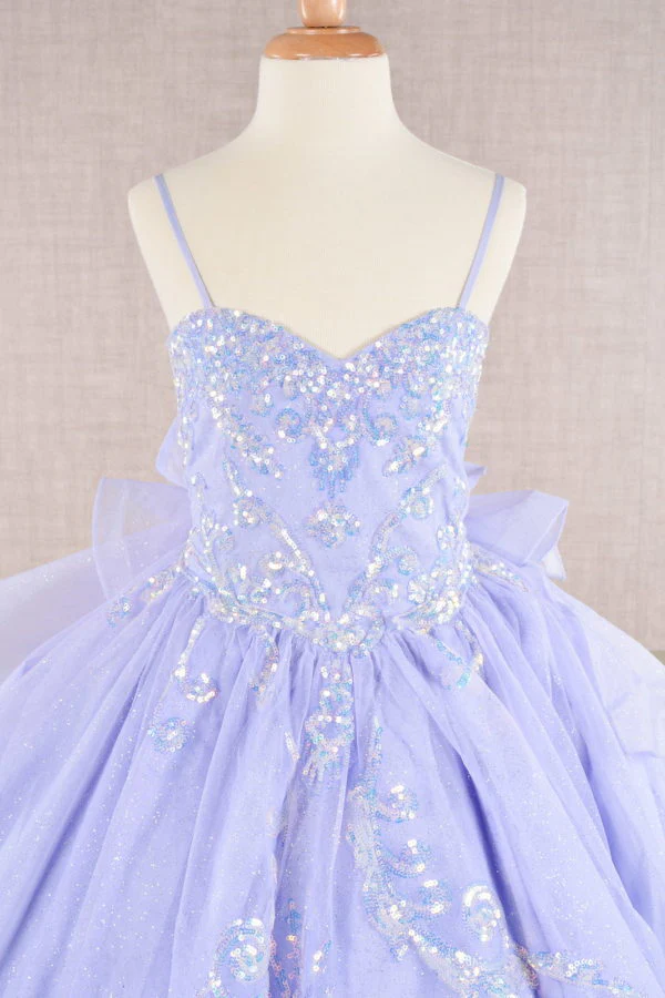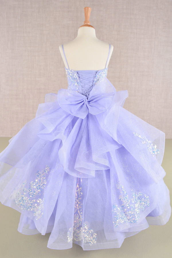 Details: Spaghetti Strap Sequin Mesh Kids Dress with a Detachable Ribbon and Ruffled Back Skirt
