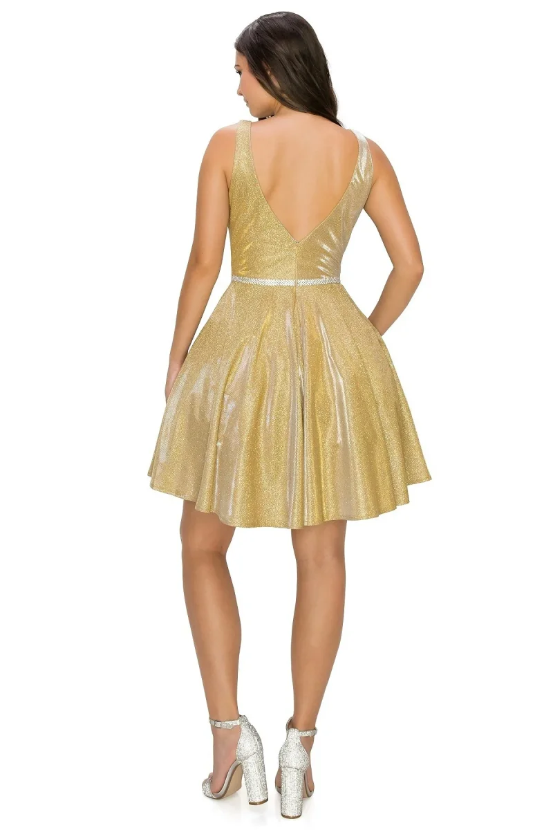 - Fabric and Details: metallic, Fitted – Sleeveless – Beaded Belt – Pleaded Skirt – V Back, Back zipper for easy entrance, 100% Polyester