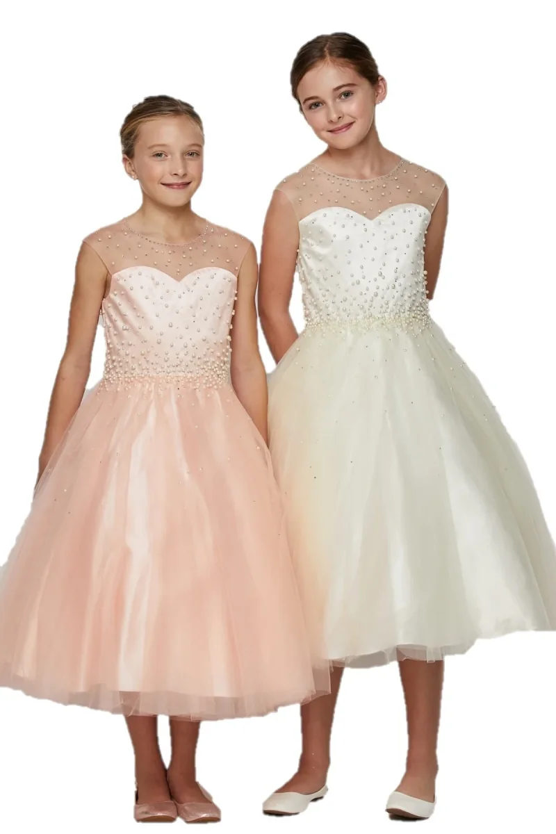 ”CINDERELLA COUTURE” Elegant illusion neck pearl satin tulle cap sleeve T-length dress. Professionally crafted with all hand made pearl rhinestone design. This is perfect for all occasion.