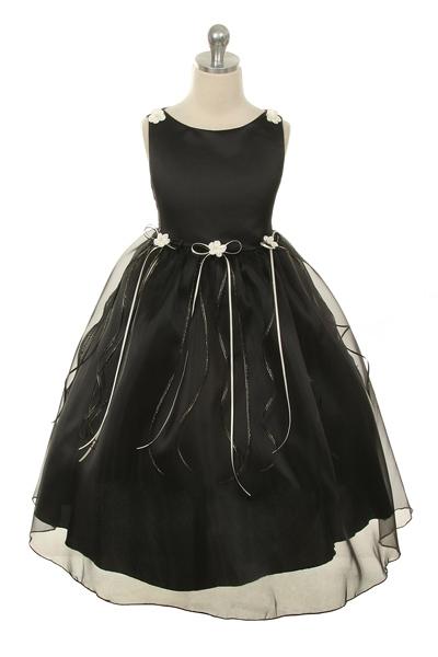 Classic satin and organza dress with matching rosebuds with ribbons. The dress has a very soft and elegant look.