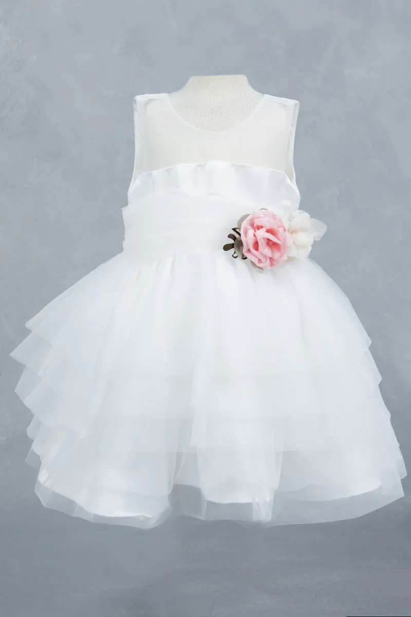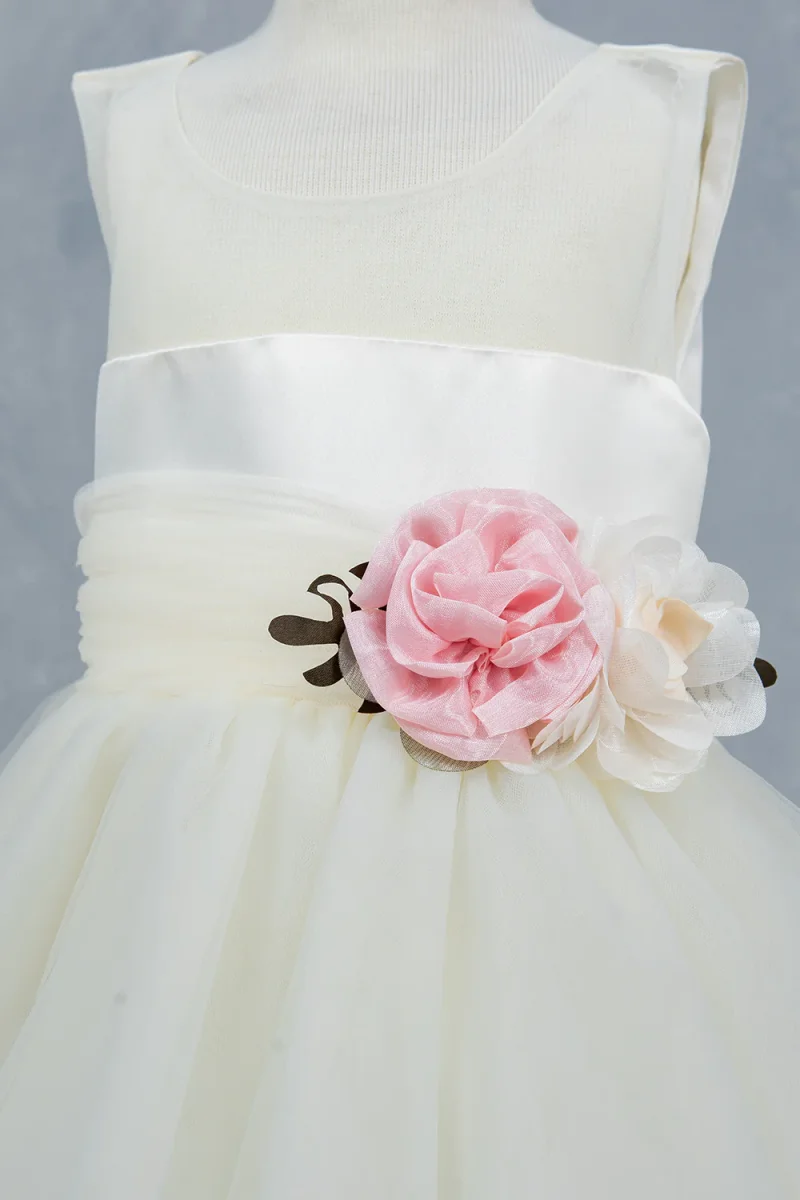 ” CINDERELLA COUTURE ” A sleeveless bodice with a clean and elegant design, paired with a satin waistband that accentuated by a floral embellishment consisting of delicate fabric flowers in pink and ivory tones, complemented by leafy accents for a natural, sophisticated look. A multi-layered tulle skirt with a tiered design, creating a voluminous and flowy silhouette.