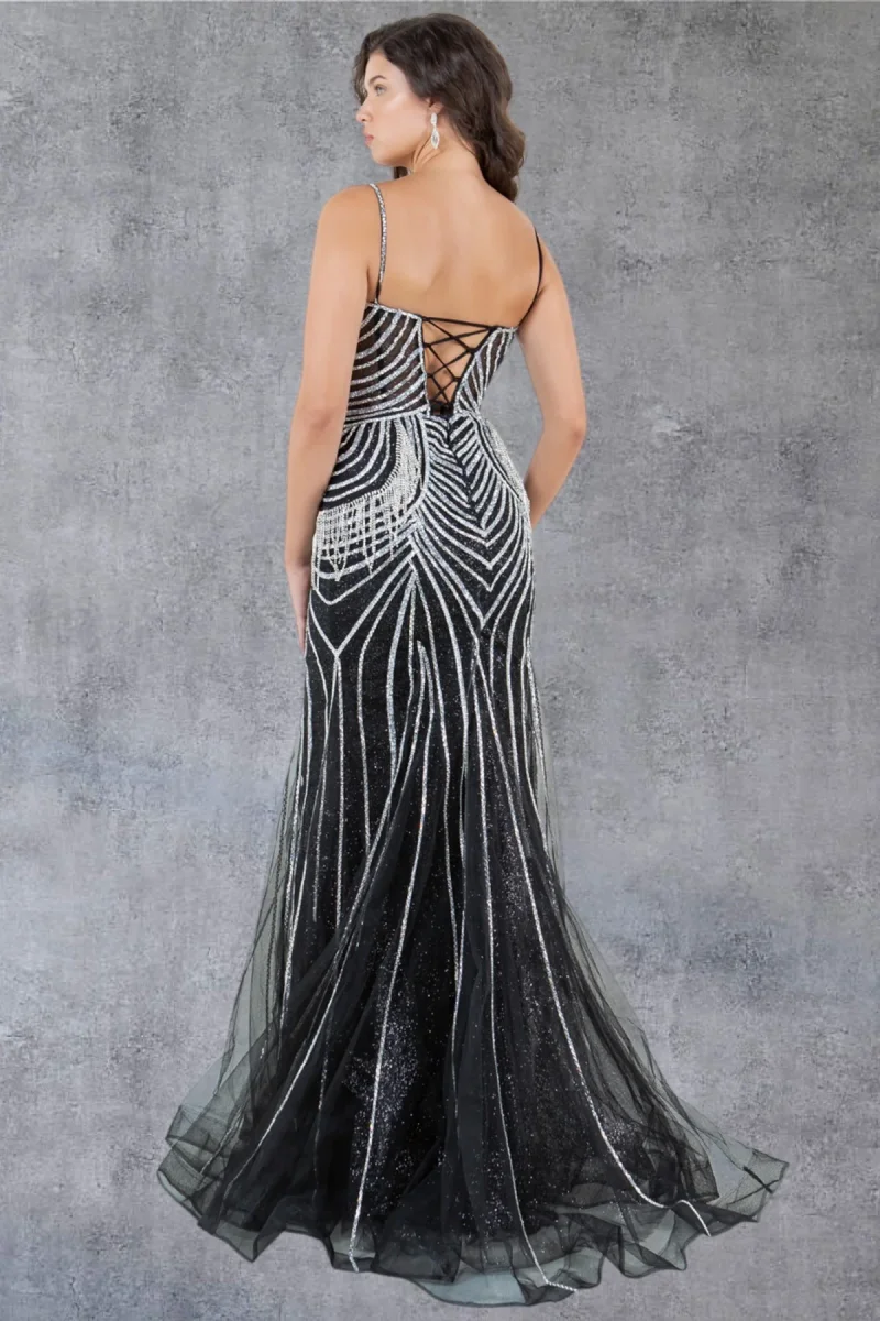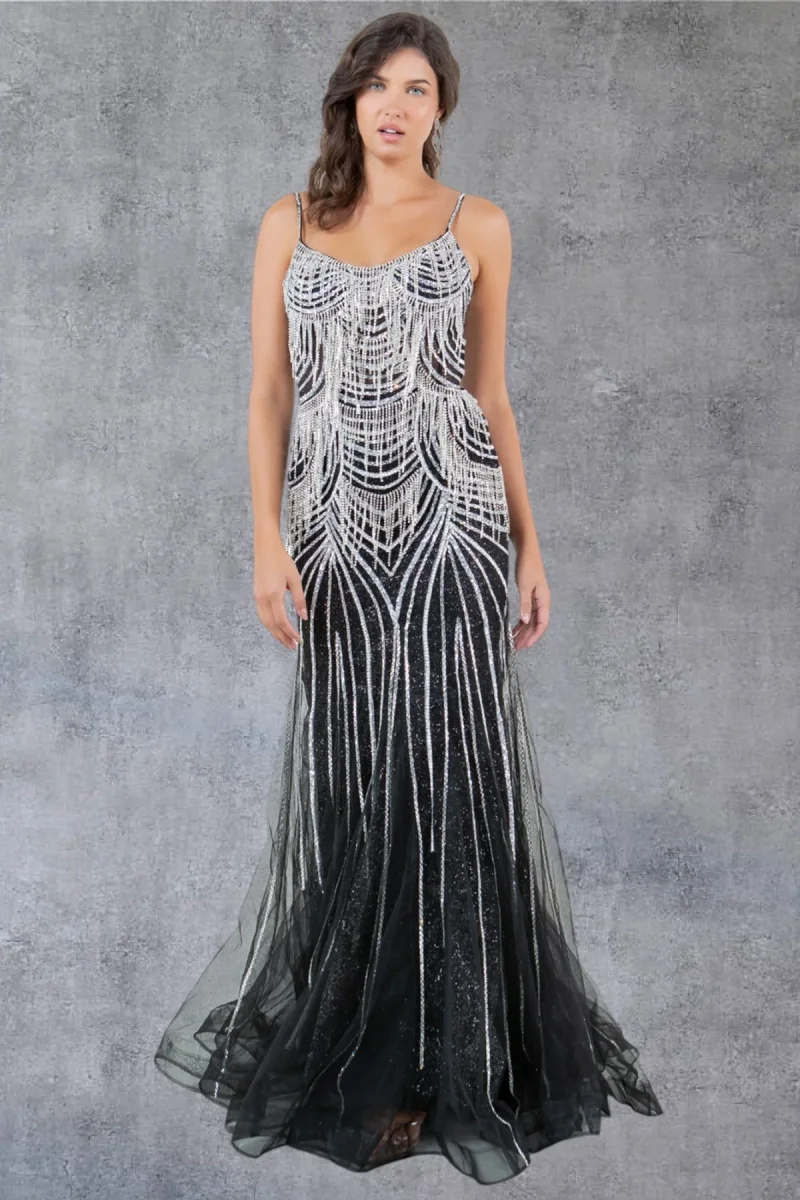 Be the spectacular belle on your next formal event, a captivating choice for your special occasion. This gown features intricate beaded fringed details, delicate spaghetti straps, and a laced-up back for a touch of allure. With its natural silhouette and horsehair hem, it ensures a flattering and comfortable fit for a memorable night of sophistication and style. Step into the spotlight and make a lasting impression at your formal event.