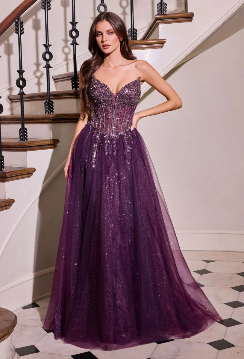 Shop our Ladivine CD721. Radiate elegance in this A-line evening gown, designed with a strapless sweetheart neckline and a corset bodice shimmering in dazzling crystal beadwork. The structured top gives way to a flowing layered glitter tulle skirt, creating volume and movement with every step. Complete with a supportive fit and radiant sparkle, this gown is a captivating choice for prom, black tie, and formal occasions.